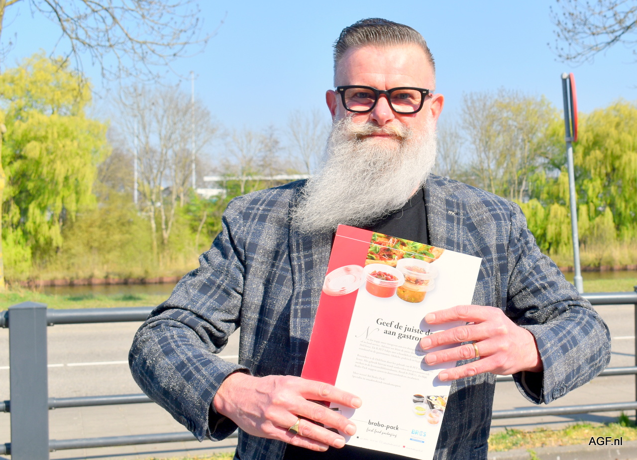 Eugène Hogervorst  van Brabo-Pack ontmoetten we buiten. Trots op de mooie achterpagina van Primeur waarop de Brabo-Pack advertentie prijkt. Even poseren.