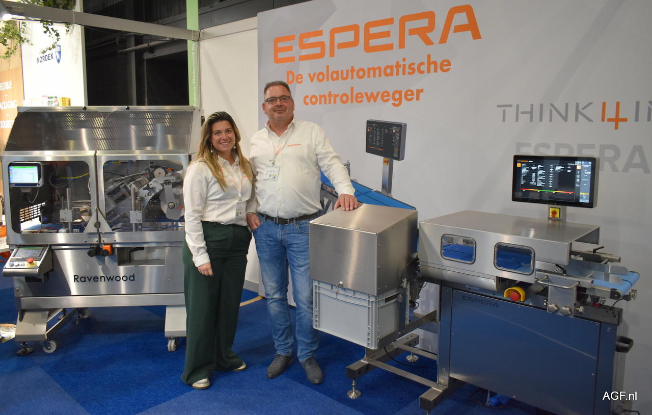 Mischa Schmitz en Lotte Bronkers van Espera Nederland poseren bij een volautomatische controleweger.