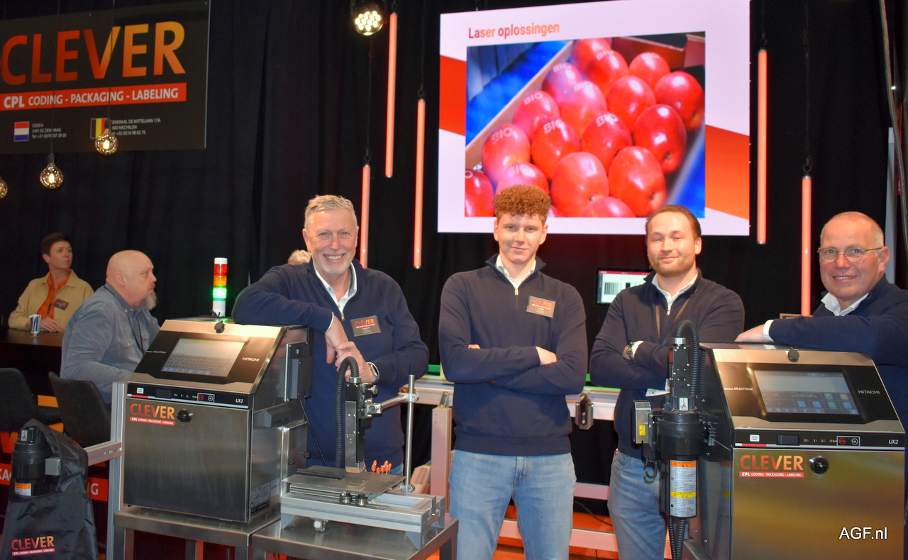 Gerhard Kramer, Lucas Weert, Olivier Siebert en John Mooij van Clever-CPL. Laser codeersysteem voor fruit.