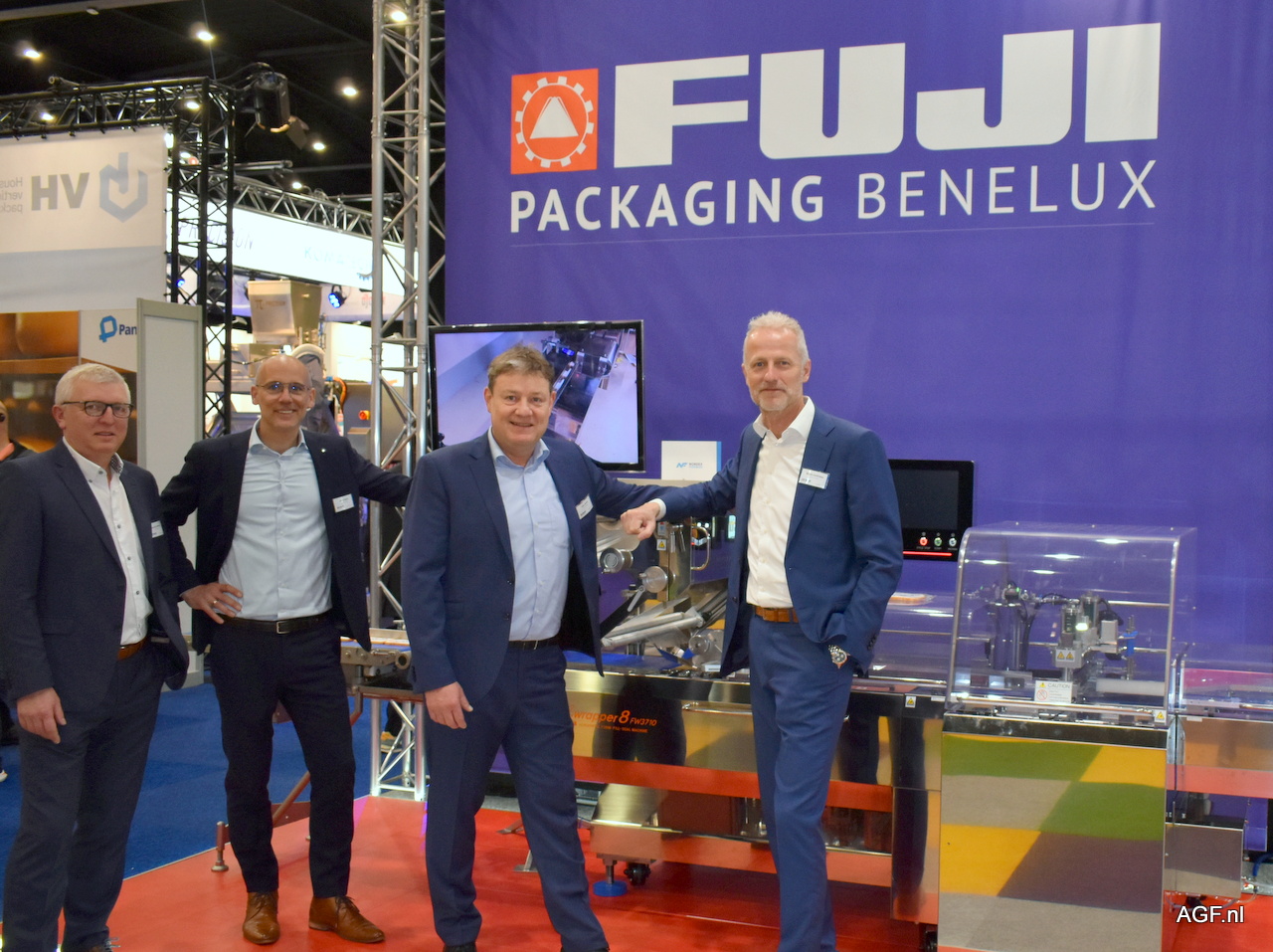 Fuji Packaging Benelux: Ronald Collewet, Peter Matel, Olav Sinke en Rinze Jonkman poseren bij de Alpha 8 Fuji Flowpacker voor bv puntpaprika, stoplichtpaprika en bosuien.
