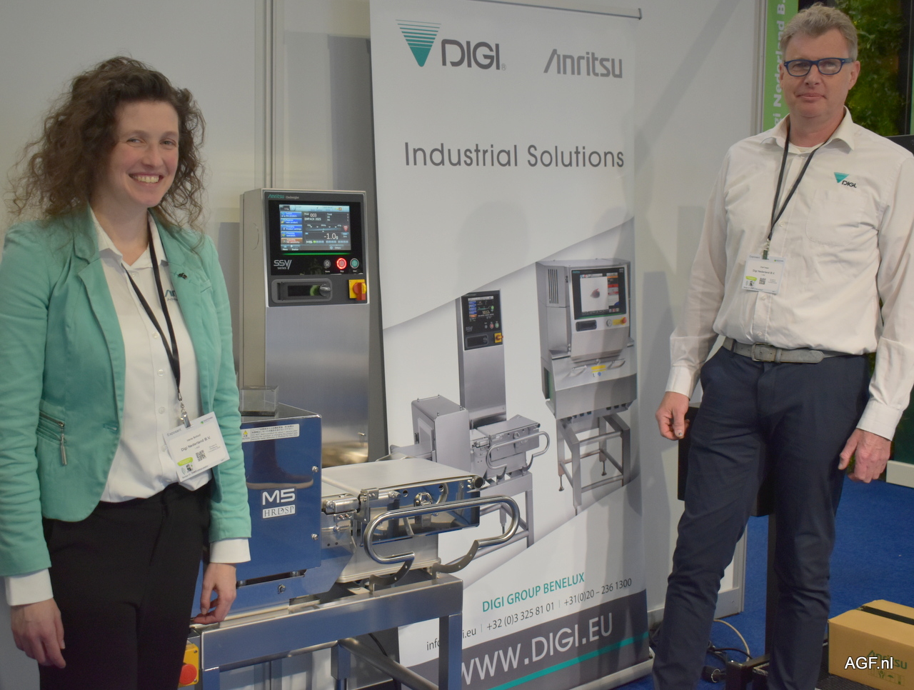 Sarah Husain van CLK en Wim Nelemans van Neroco Detectie poseren bij het Multicheck systeem. Een systeem om plastics te identificeren in voedselstromen. Het CLK MultiCheck (MC)-systeem gebruikt camera-inspectie en maakt onderscheid op basis van kleurverschillen. Naast plastic kunnen ook andere materialen gedetecteerd worden. Het systeem wordt onder een multiheadweger geplaatst en tijdens de val detecteert het defects. In België is Roosjen leverancier voor dit systeem.