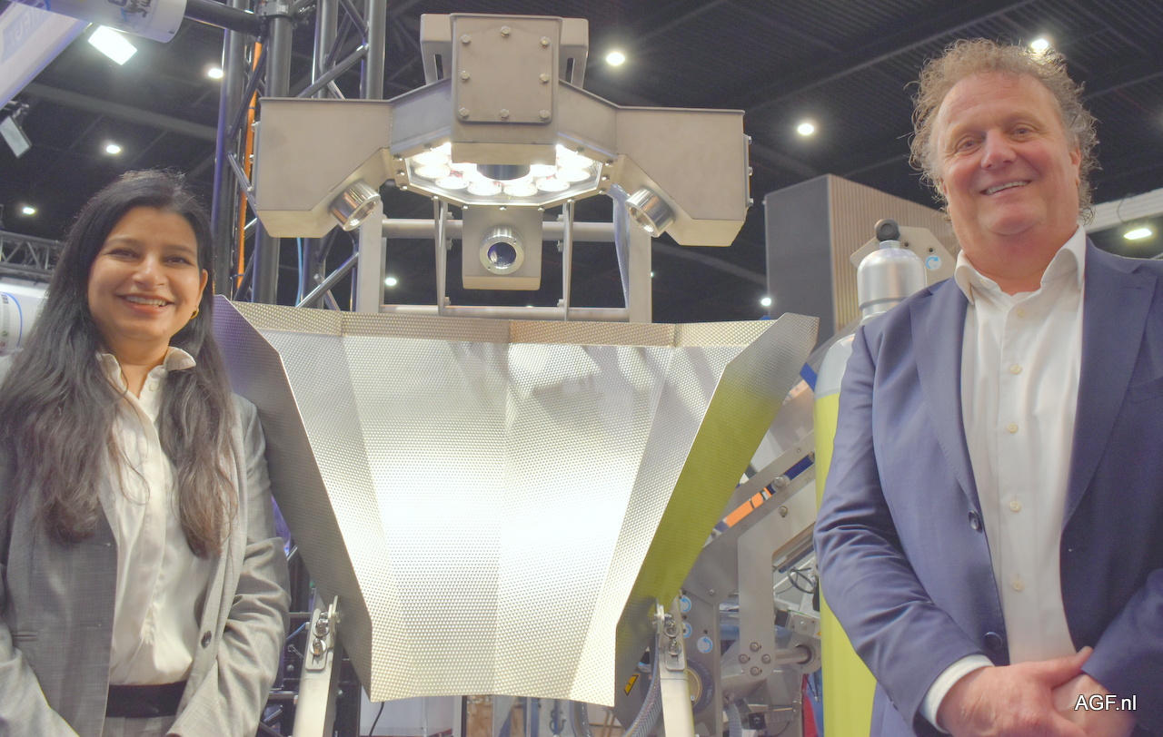 Peter Paul Zwager en Nicole Jordens poserend bij een Reepack machine type Reeeco. Automatisch ontnesten en vullen van trays, sluiten met topseal toepasbaar voor een breed AGF pakket.