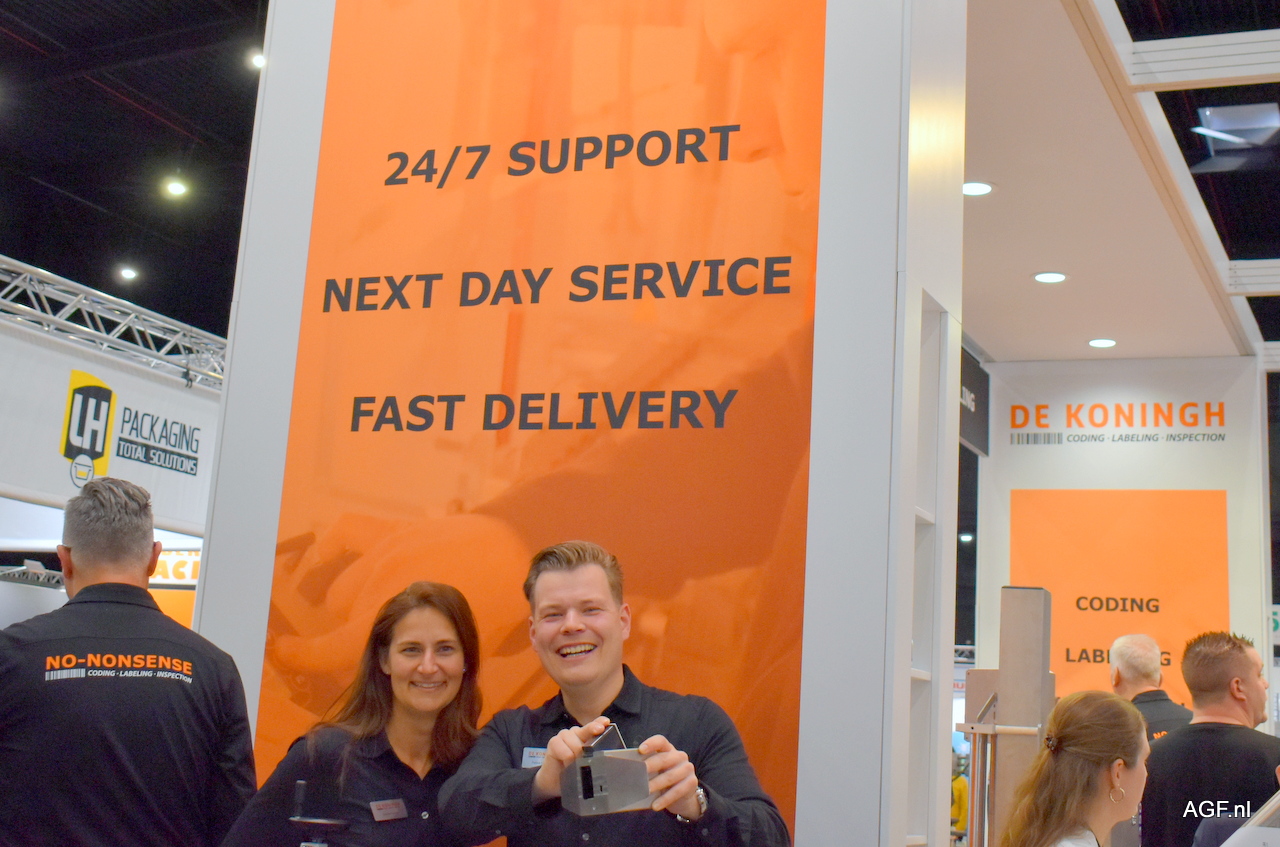 Debbie Poulus en Patrick Craanen van De Koningh coding, labeling en inspecteren. Patrick toont een compacte industriële printer voor barcodes, datamatrix, variabele data met vervangbare cartridge. Een nieuwe cartridge is meteen een nieuwe printkop. Vooral bij seizoenproducten waar een printkop korte tijd wordt gebruikt en daarna weer voor langere tijd stilstaat gebeurt het dat de printkop verdroogt. Door het vervangen van een cartridge met geïntegreerde printkop voorkom je dat je eerst problemen op moet gaan lossen en kan je direct starten met printen.