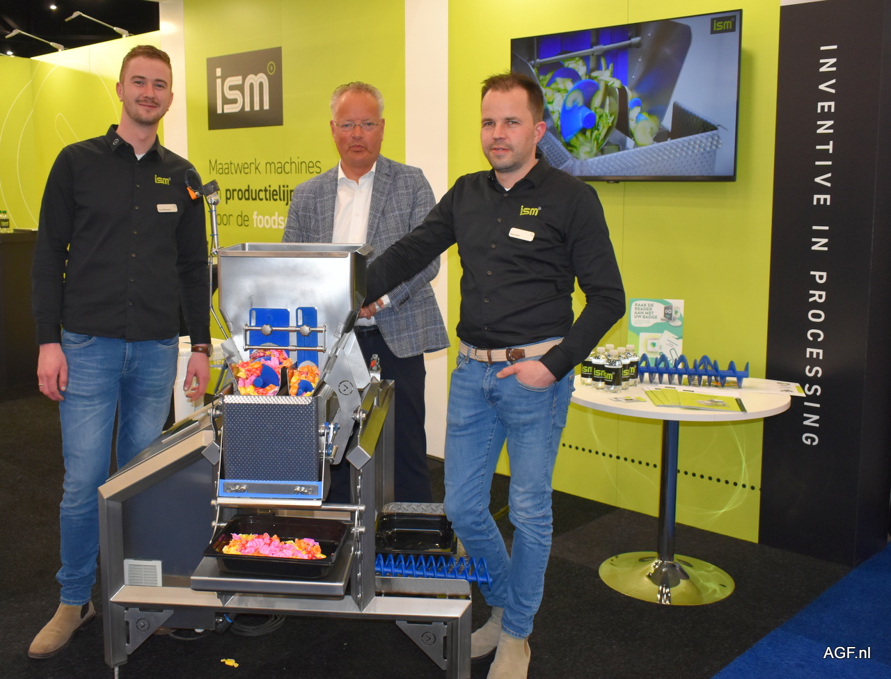 Lars Wiskerke, Jan Roukens en Kees Mol van ISM poseren bij de nieuwe uitvinding. De schroefweeg combinatie, voor het handmatig afvullen van plakkerige producten.