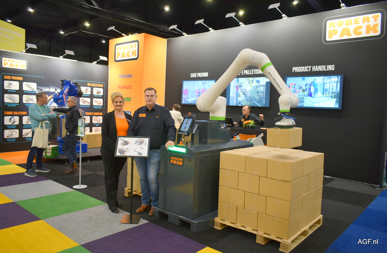 Angelique Meester en Klaas Zonnebeld van Robert Pack. Rechts een Cobot Palletizer.