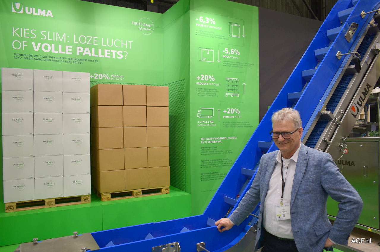 TightBack is een nieuw concept van Ulma om meer volume in een trailer of op een pallet te krijgen. Het wordt gerealiseerd door de lucht in een verpakking te verminderen. Dit verdiend een extra fotootje met Alex Hofstee.