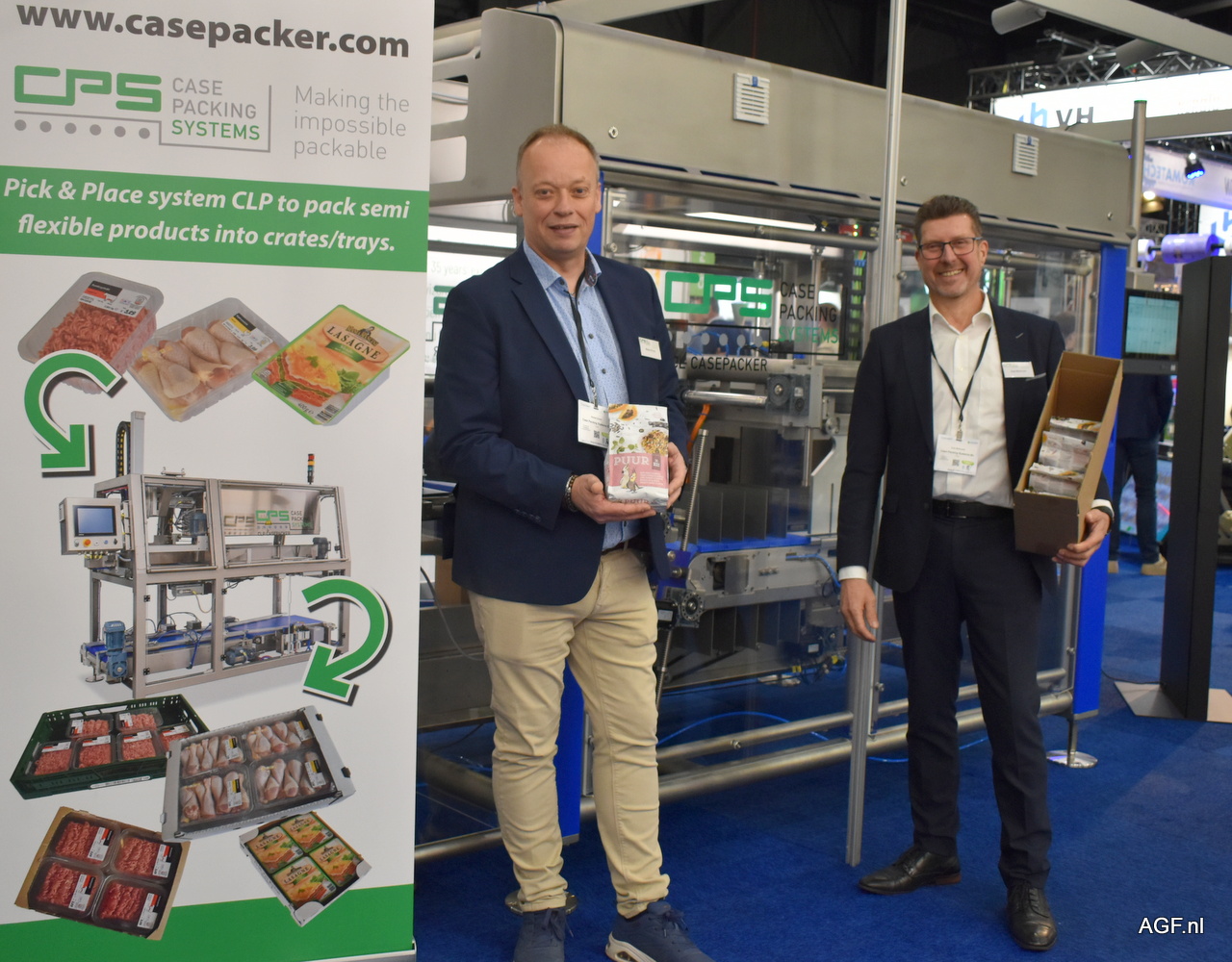 CPS, Robert Evers en Joan Berkvens poserend bij de GCL casepacker voor het verticaal verpakken van o.a. blokbodemzakken.