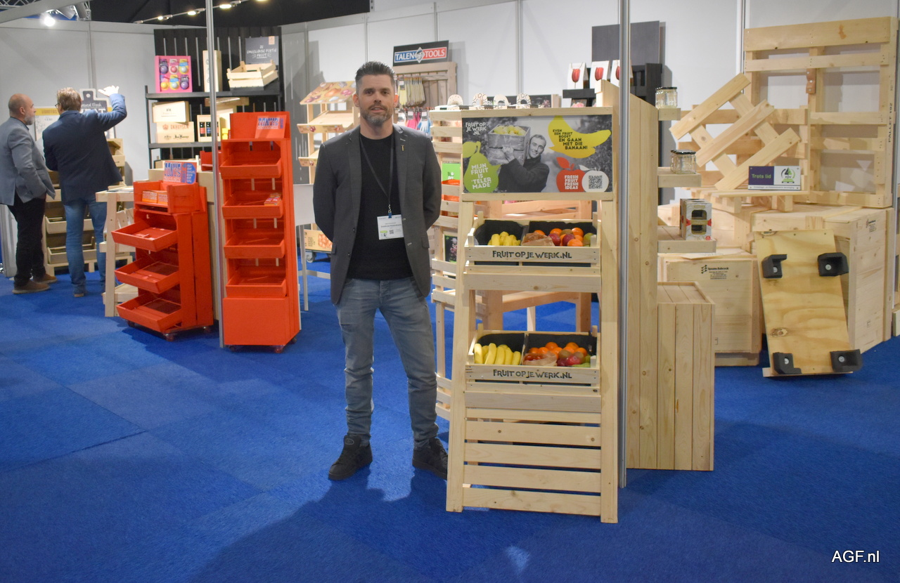 Albert Schoneveld van Goedkoop Houtindustrie. Houten displays voor fruit op het werk.