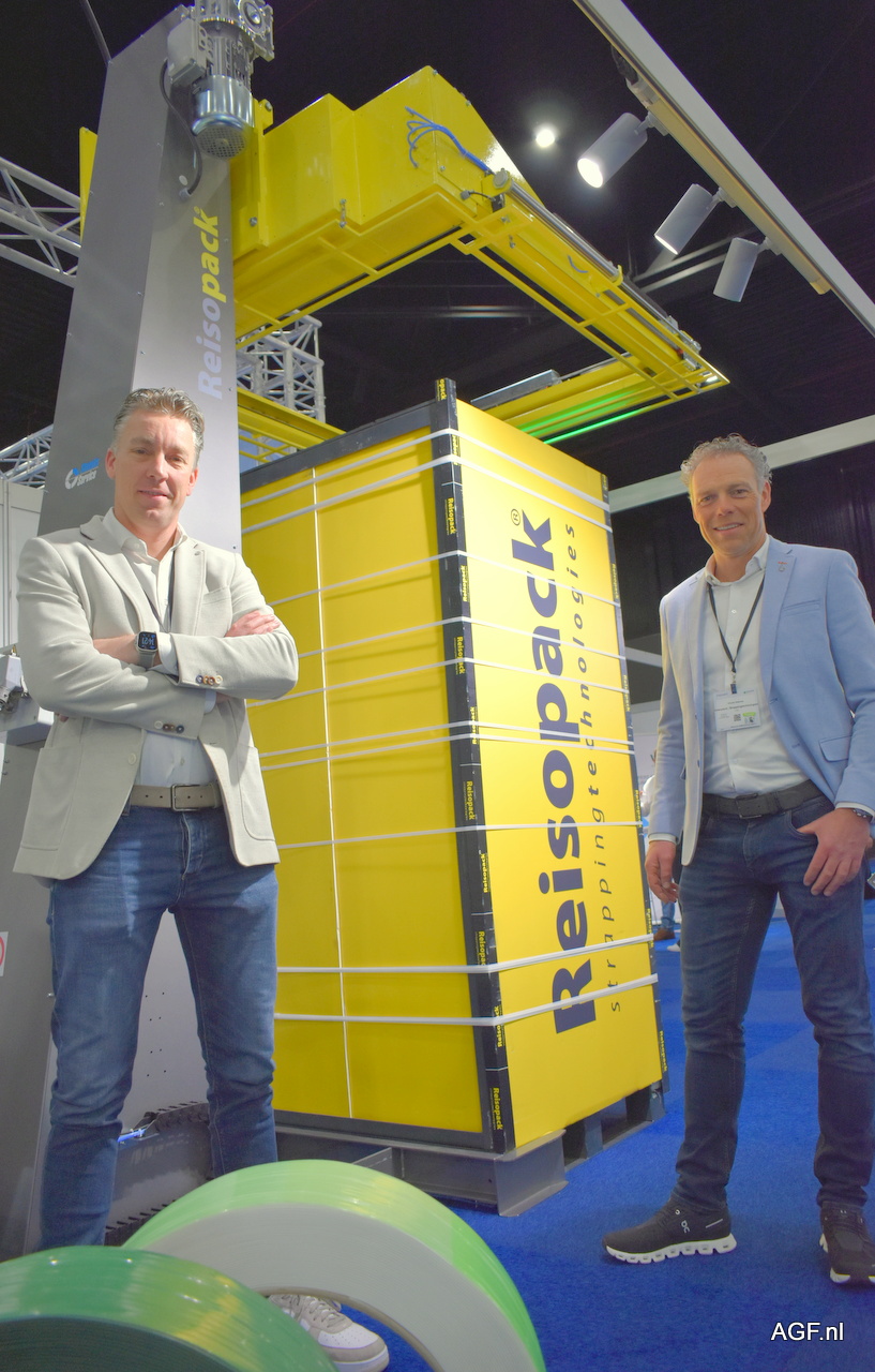 Sander Zuidgeest en Wouter Steenks van Reisopack palletomsnoeringsmachines. Met deze machine kan de pallethoeksteun automatisch worden geplaatst en 3 straps eromheen in nog geen 55 seconden.
