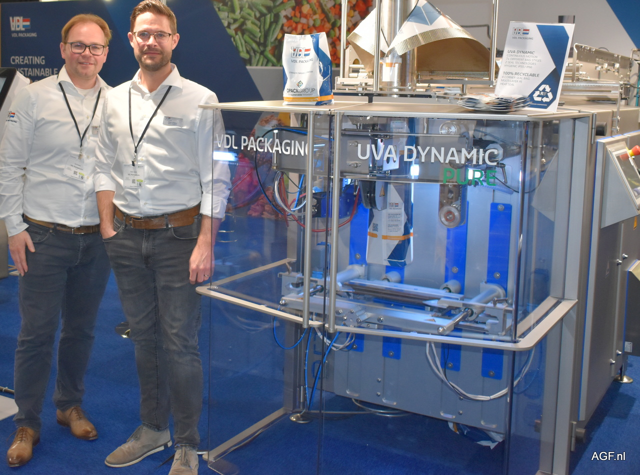 Job Kusters en Koen Joppen van VDL Packaging. Rechts de UVA Dynamic Pure, een verticale vorm, vul en sluitmachine.