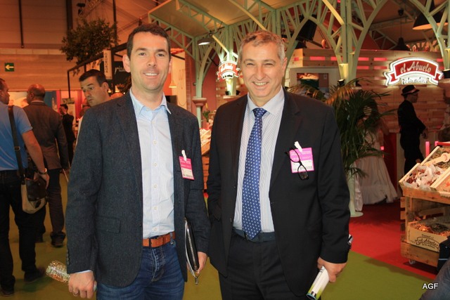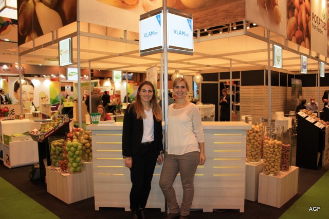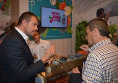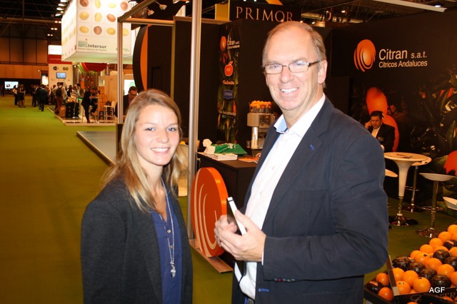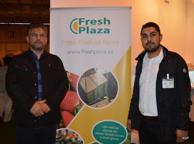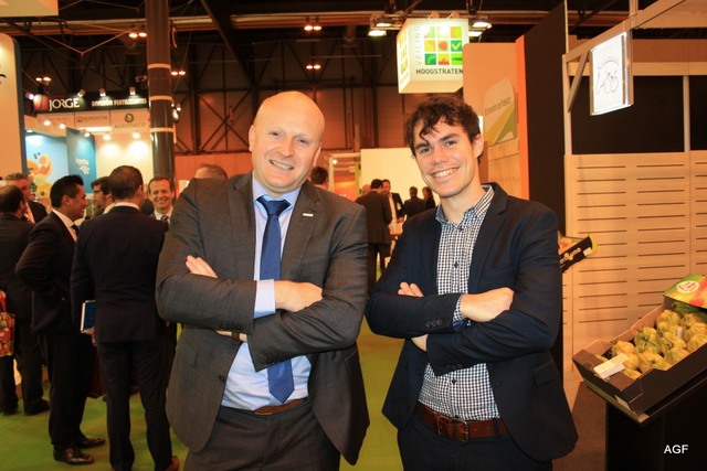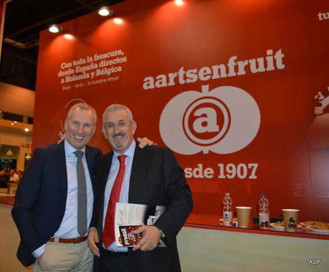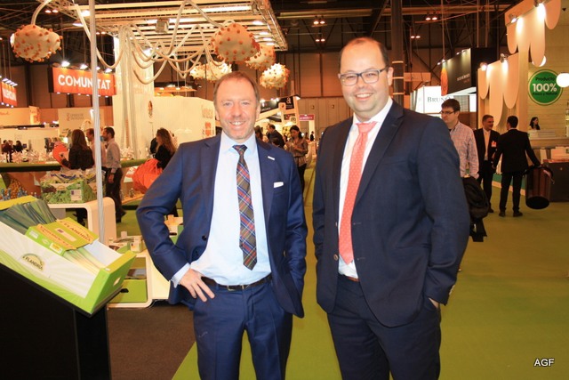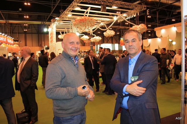 Filip Fontaine van BelOrta en Jeroen Buyck van Calsa willen natuurlijk wel even lachen voor de foto. Jeroen was te spreken over het feit dat hij een artikel had in het eerste nummer van Primeur Fruit Attraction, het magazine dat tijdens deze beurs werd uitgedeeld.