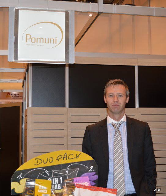 Raf Sels van Pomuni is leverancier van diepvries en verse aardappelproducten. Nieuw in het assortiment is de Duopack. Dit is een verpakking waarin 2 verschillende aardappelrassen gescheiden verpakt worden. Deze week lancering bij Delhaize.