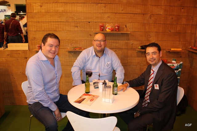 Een gezellig onderonsje in de stand van Hoogstraten. Johan De Gendt van Nicolai Fruit, Natalie Snijers van Hoogstraten en Philiep Willems van BelOrta.