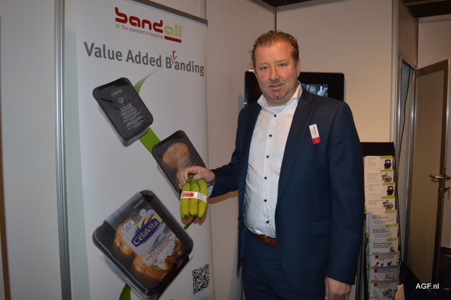 Erik de Roos van Bandall toont bananen met banderol. Je onderscheiden in het bananenschap, niet met een etiketje maar met een opvallend bandje.