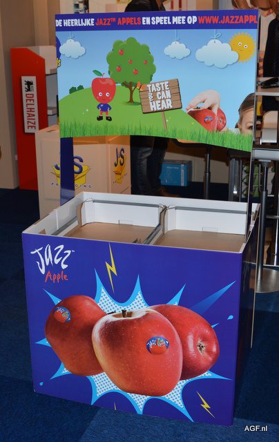 J&S packaging is trots op de nieuwe display voor de Jazz appel van Enza. In deze opvallende display passen 2 fruittrays van 60/40 en geeft een mooie presentatie op de winkelvloer. Steve Segers, Pascal Piery en hostess Manon Ferket.