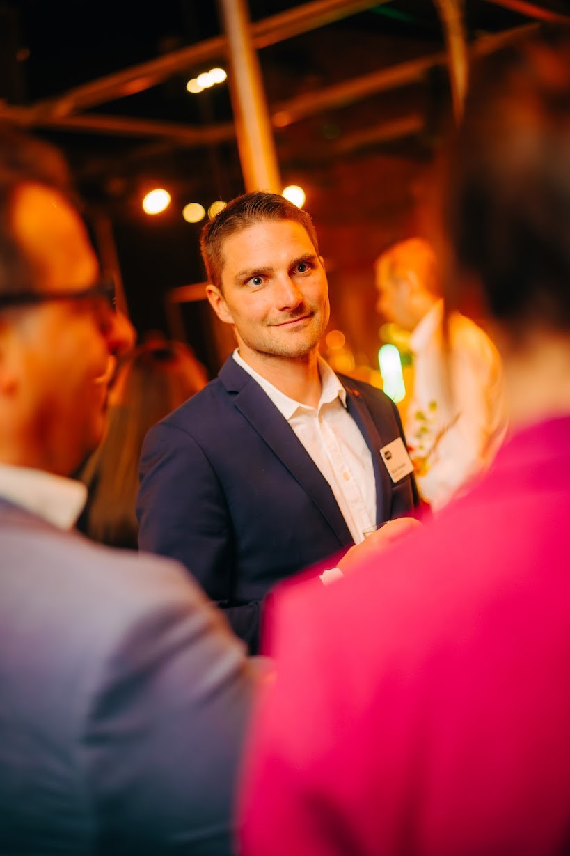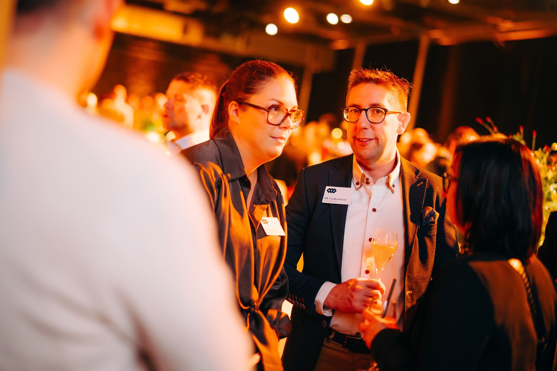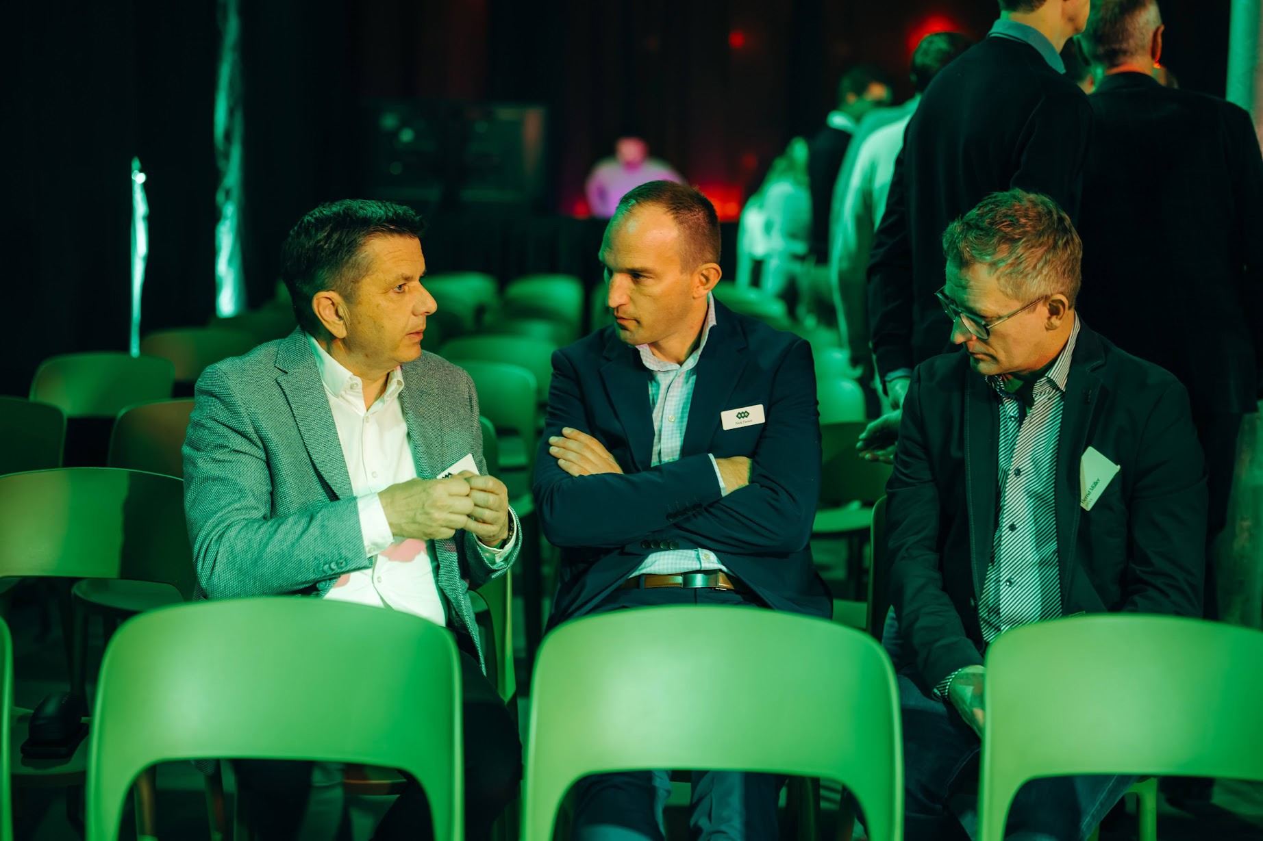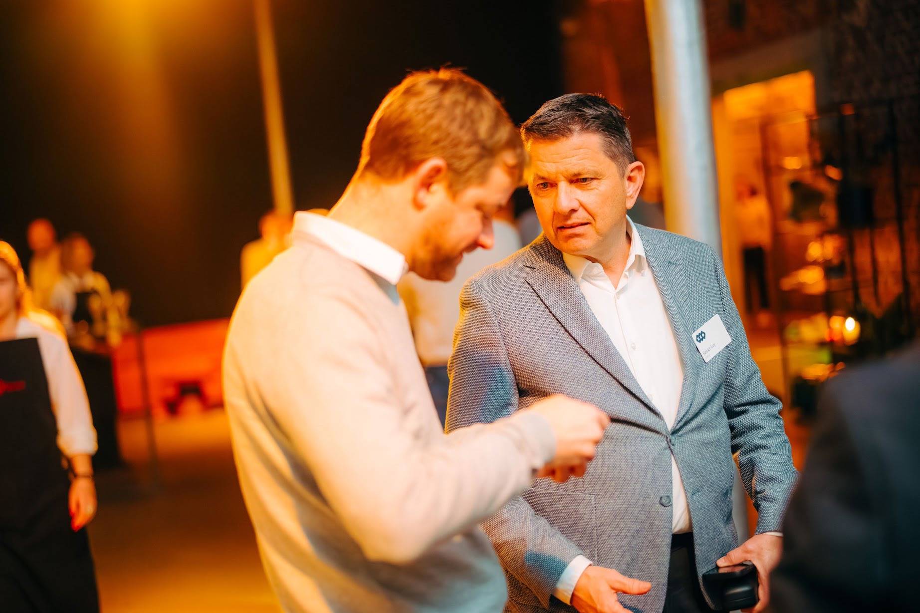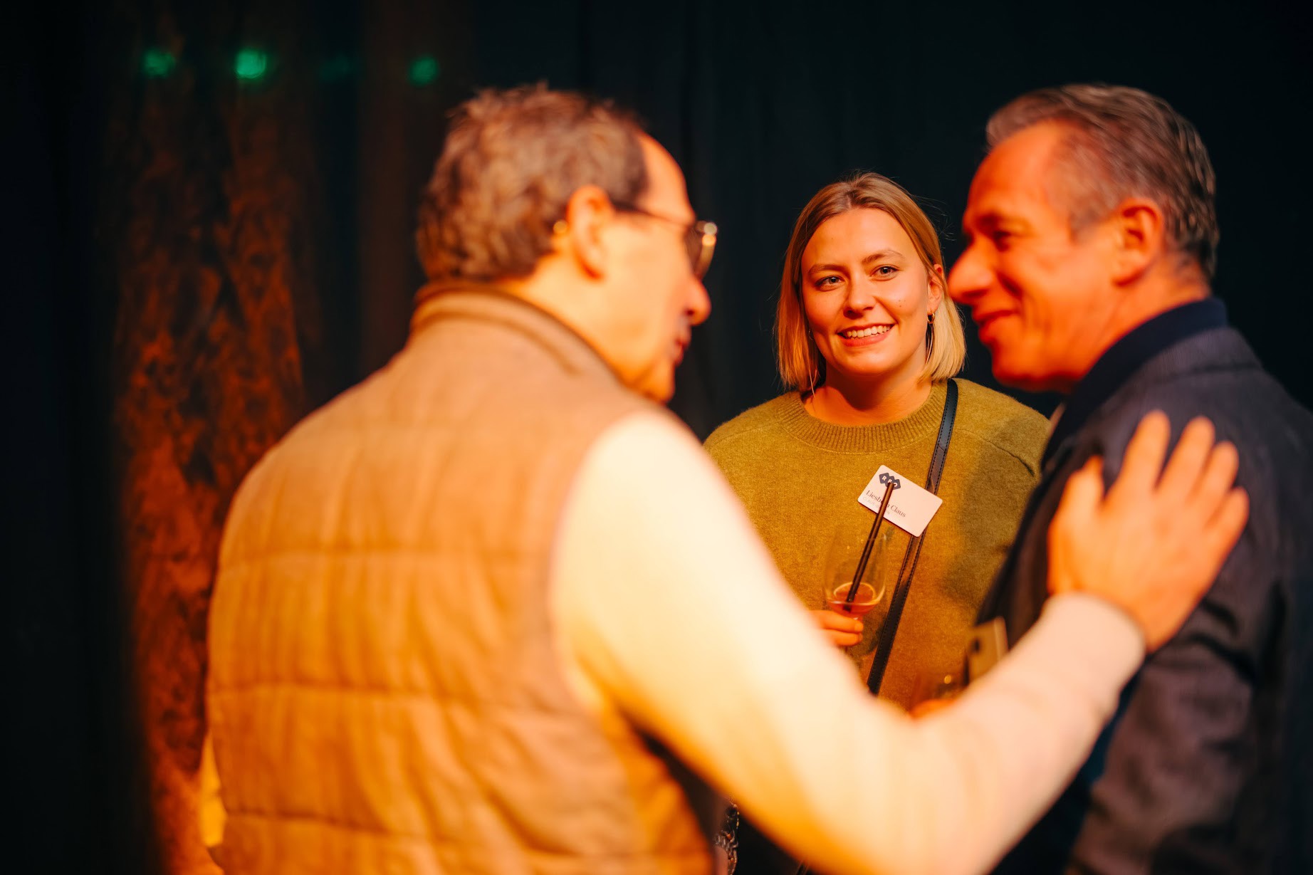 Gezelligheid in de zaal met onder meer Johan Chretien (Rejo Fresh), Liesbeth Claus en Caroline Baeten (Claus - Baeten) en Guy De Meyer (Demargro)