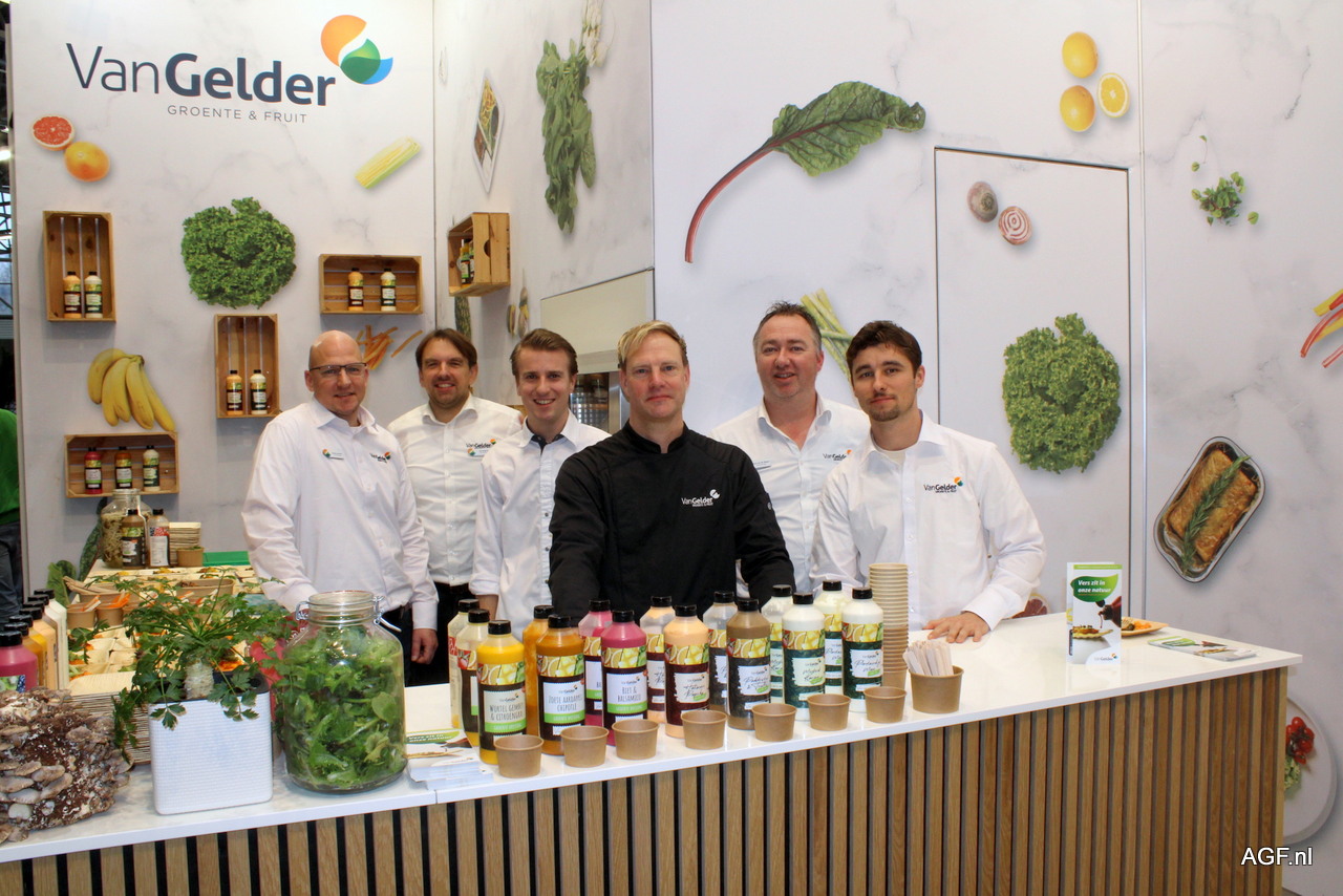 Dennis, Ron, Jules, Joost, Hans en Liam van Van Gelder groente & Fruit. Van Gelder speelt erop in om de keuken nog makkelijker te maken. Van Gelder lanceert tijdens Horecava 2026 een nieuwe lijn van zeven volledig plantaardige sauzen en dressings voor de foodservicemarkt.
