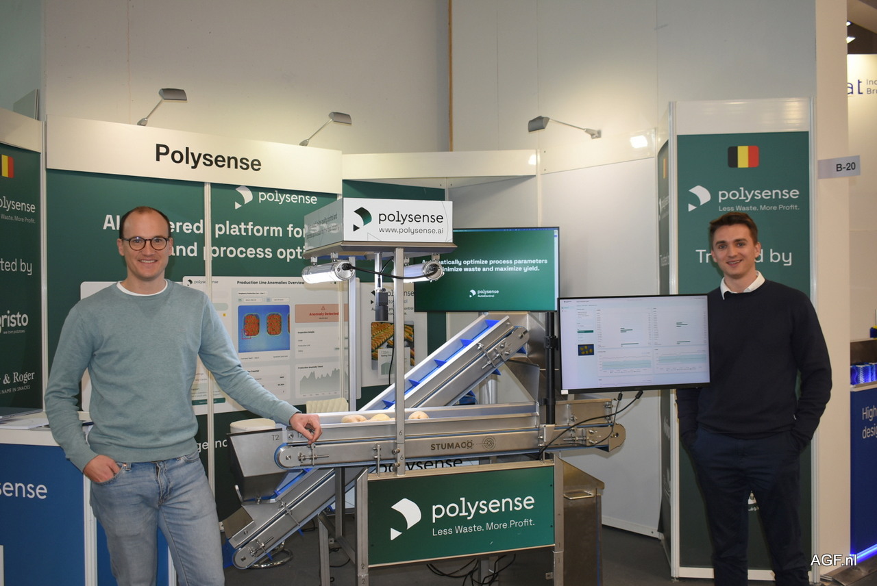 Jens Massaert en Yarne De Munck van Polysense. De start-up debuteerde op de Fruit Logistica en focust zich op AI-toepassingen in productieprocessen om minder afval te produceren en efficiëntie te verhogen.