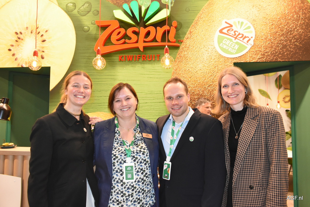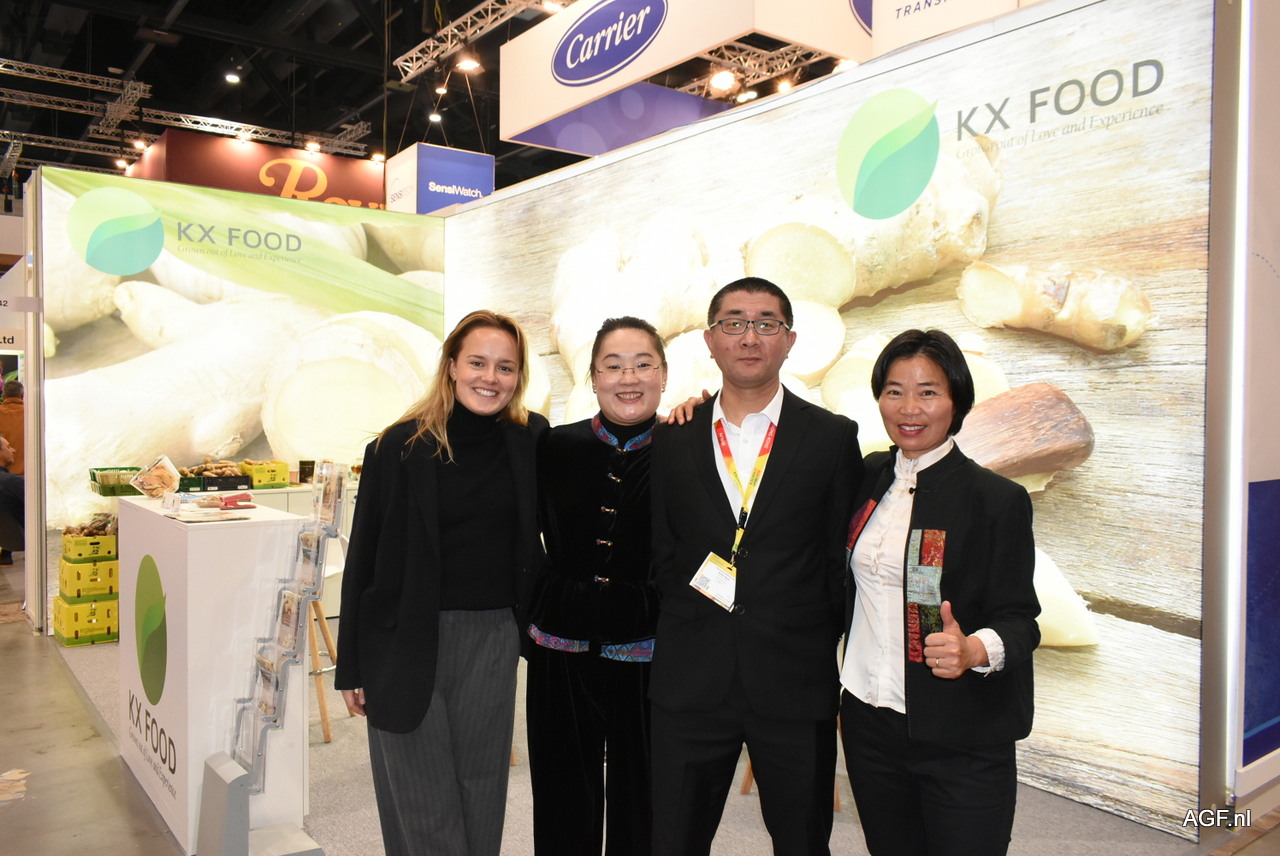 Leonie Kahl, Min Li, Sophie Ye en Walter Wang poseren trots voor de eerste stand van het bedrijf op de Fruit Logistica. Een positieve beurs en een goede keuze, zo beschreven ze de eerste deelname als standhouder