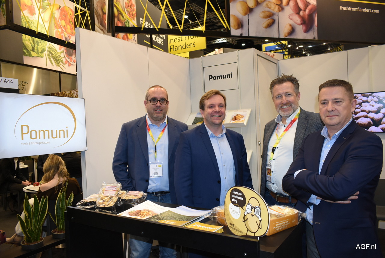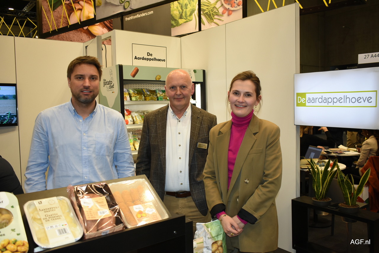 Wouter Devlies, Bart en Ellen Nemegheer van De Aardappelhoeve, die haar vierde gamma van The Potato Chef weer naar voren brachten tijdens de beurs