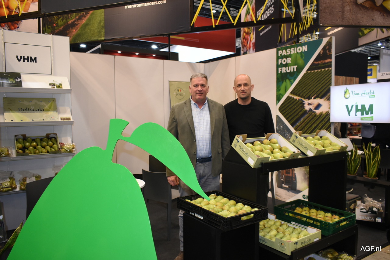 Christophe Van Haelst en Francesc Salata Costa van VHM Fruit Trade/Van Haelst Fruit. Centraal op de stand stond het nieuwe merk Deliscala, waarmee het bedrijf peren naar de Chinese markt exporteert