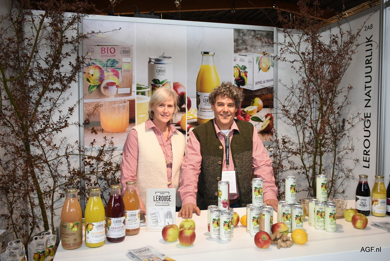 Krista en Frederic Lerouge van Lerouge Natuurlijk, dat haar verse (biologische) bruisende fruitsappen aan het publiek liet zien