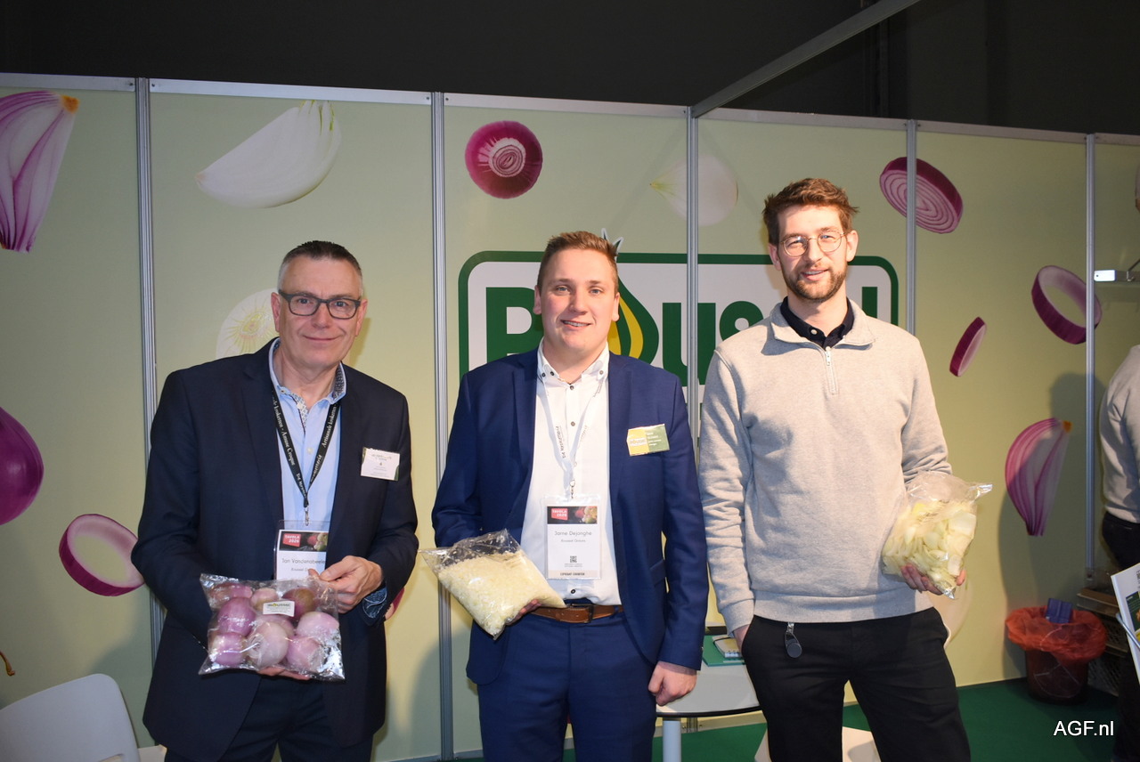 Jan Vandenabeele, Jarne Dejonghe en Maxime Roussel van Roussel Onions, dat het nieuwe vacuümverpakte gamma op de beurs introduceerden.