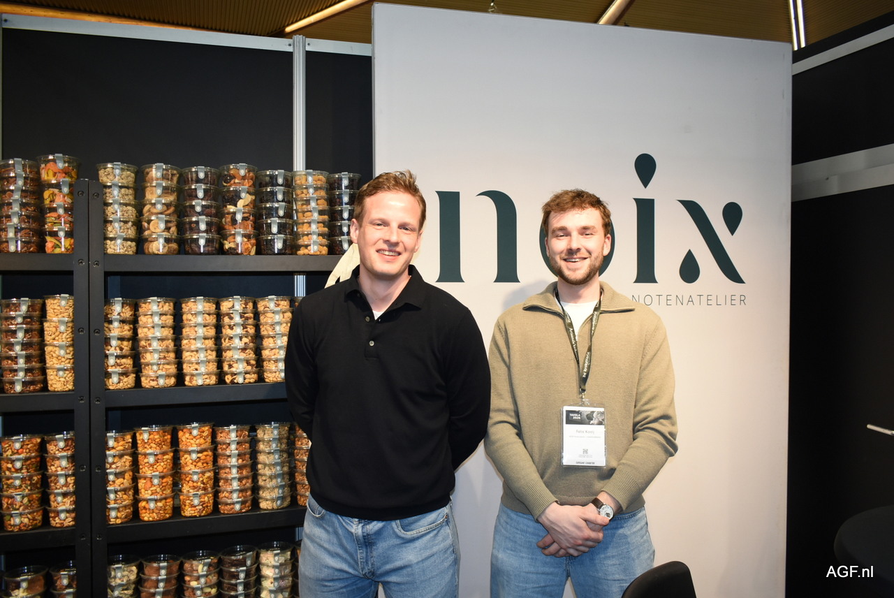 Jasper van Dijk en Felix Kooij van Noix Notenatelier. Het Nederlandse notenbedrijf levert vers gebrande noten, ambachtelijke chocolade, zuidvruchten, zaden en pitten aan kwaliteitsspeciaalzaken, horeca en geschenkpakketten branche. Hierbij zien ze ook een mooi potentieel in België, wat op deze beurs verder ontdekt werd