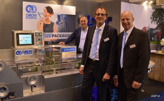 Omori Europe toonde een rekfoliemachine voor brede toepassingen in de AGF sector. Deze machine haalt een capaciteit van 120 bakjes per minuut. V.l.n.r. Jeroen Munster, Vincent van der Ster, Willy Baalhuis.