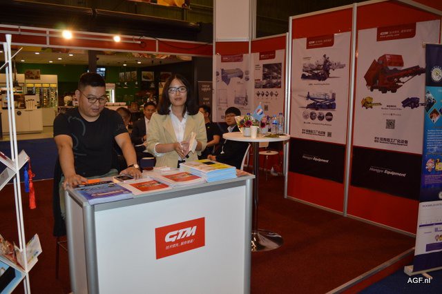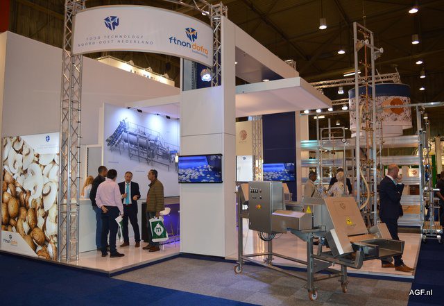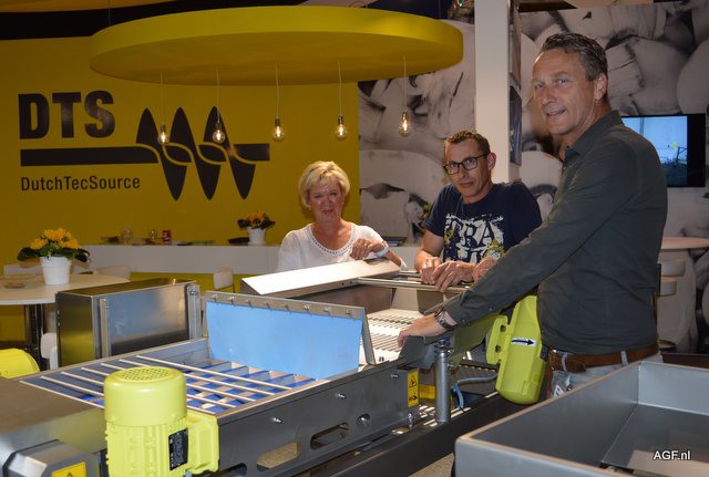 DTS Dutch Tec Source is een leverancier van complete verwerkingslijnen voor de AGF sector. Op de beurs werden snijmachines getoond voor het in partjes snijden van champignons. De machines onderscheiden zich door het hoge niveau in afwerking. Jacqueline Wakker, Jan Mercken van Mushroom City uit Belgë en Peter van der Stouwe.