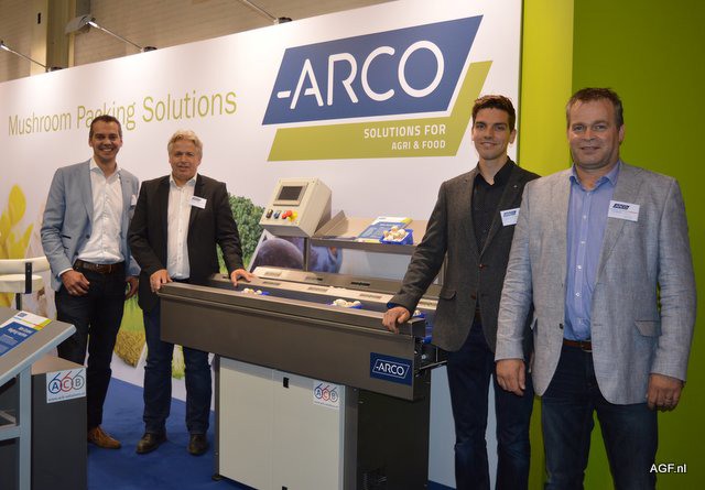 Arco, onderdeel van de ACB groep toonde een complete champignonverwerkingslijn om paddenstoelen te wegen, te verpakken en te etiketteren. Met de oplossingen van Arco valt veel geld te verdienen doordat er efficiënt wordt afgewogen, minder handjes nodig zijn en minder product wordt weggegeven door een nauwkeurige weging. De machine is in te stellen van 50 gram tot 1 kilo. V.l.n.r. Ralph Wijnands, Albert Vermeulen, Jordy van der Sterren en Ger van Knippenberg.