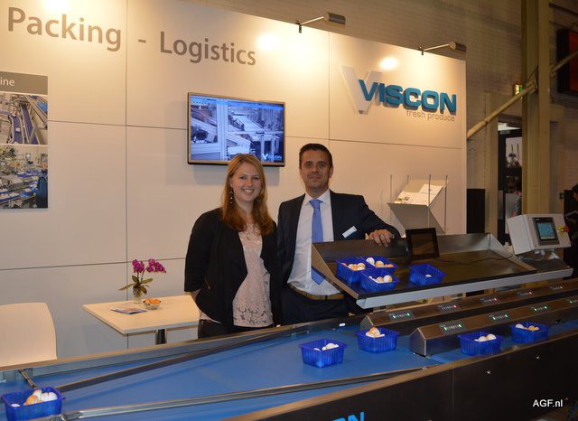 Viscon Fresh Produce, Arie Kamp en Muriël Baars staan achter de checkweeglijn Sigma. Schaaltjes worden op gewicht gecontroleerd en handmatig aangevuld tot het juiste gewicht. 10 weegschalen meten gelijktijdig het gewicht wat zorgt voor een capaciteit van 100 verpakkingen per minuut. De machines worden wereldwijd geplaatst.