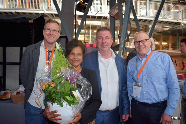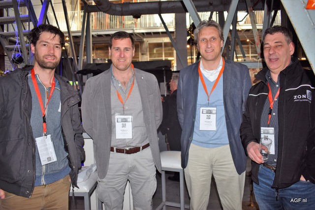 Toeleveranciers waren ook op de jubileumbeurs te vinden. Van links naar rechts Rick van de Ven (ZON), Aart Bezemer en Rick de Deken (Aartsenfruit) en Leander van de Griend (ZON).