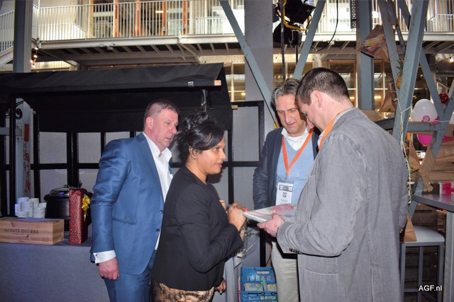 Frans en Daphne (l) trakteren Aart Bezemer (r) en Rick de Deken (l) van Aartsenfruit die hen kwamen feliciteren, op een presentatieschaal.