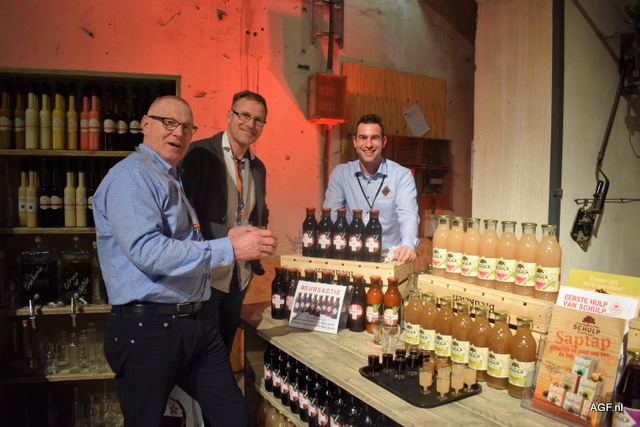 Markthandelaren Gerard en Eddy Derks (l) nemen een kijkje bij Willem Koemans van Schulp sappen die bij de Voets Specialiteiten Voorjaarsbeurs een plekje vond.