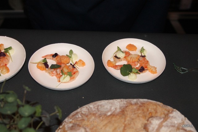 plaatje gemarineerde gamba met ingelegde bloemkool, cress en aioli