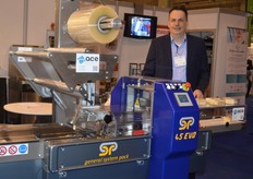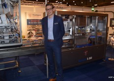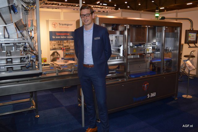 Rolf Sonneveld van Tramper Technology bij de topseal machine S360. Deze machine wordt gebruikt voor het verpakken van maaltijdsalades. De machine beschikt over een geïntegreerde aandruk en afvulunit.