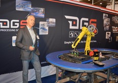 DGS maakt logistieke systemen. Paul Roland bij een eenarmige robot die gebruikt kan worden voor het in kratten plaatsen van bv schaaltjes.