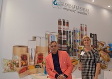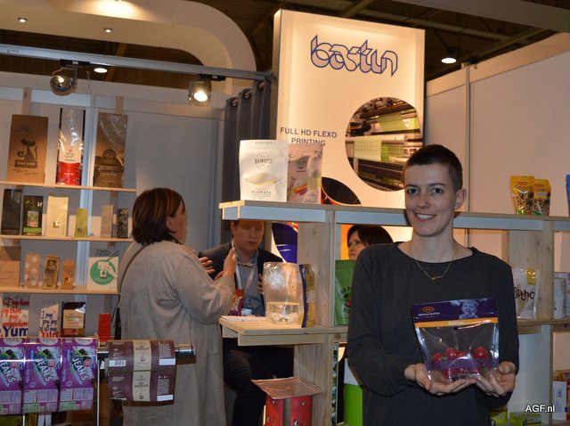 Global Flexibles, Bert Verhey en Sylvia Schimmer tonen folie met papertouch bedrukking. De folie voelt aan als papier en kan in 10 kleuren worden bedrukt. De folie kan op alle gangbare flowpackers, topseal en dieptrek machines worden verwerkt.