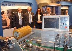 Het enthousiaste team: Marc Arends, Vincent van der Ster, Maureen Geraths en Jeroen Mulder van Omori Europe. Op de voorgrond de snelste strech wrapper in de markt, de Omori STN 8500, tot 150 verpakkingen per minuut.