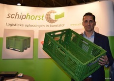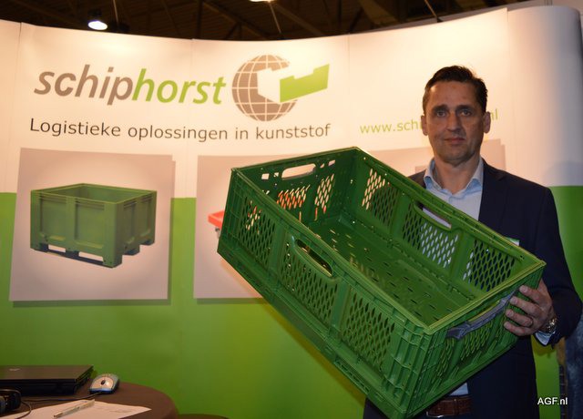 Hans van Noesel van Schiphorst met de Cleverfresh Advance klapkrat. Toepasbaar binnen de AGF sector. Inklapbaar, groot volume en een lage inklapbaarheid van 36 mm dikte.