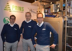 Geery Peters van Ton, Jan Strijbos en Maikel van Wiggen van Prins Verpakkingstechniek bij de verticale, vorm vul en sluitmachine de 3800 REVO.S. In RVS uitgevoerd met snelheden van 100 tot 110 verpakkingen per minuut. Geschikt voor b.v. diepvriesgroenten producenten en frietfabrieken.