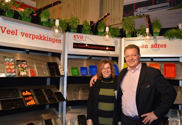 Gert Kolkman en Karin Biesheuvel van Kolkman Verpakkingen. Alle kunststof verpakkingen, vooral ook bekend van de champignonbakjes en de baboesjka verpakking. Deze laatste is een innovatief ontwerp waarbij in een grote tray diverse kleine trays met verschillende producten kunnen worden gecombineerd.