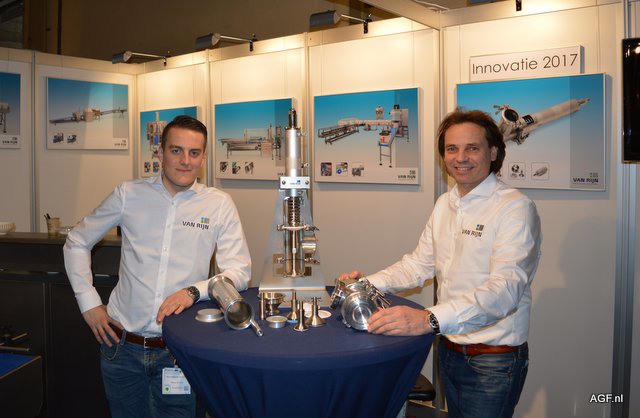 Van Rijn Processing Machinery, Marco van Dijk en Cris Klaris poseren bij de doseerafsluiter voor het vullen van emmers, potten, blikken etc. De afsluiter is uniek in zijn soort en voorzien van een flexibel teflon membraam. Hierdoor geen lekkage langs de klepsteel. De afsluiter is volledig demontabel en wisselstukken kunnen zo gemakkelijk worden vervangen of omgewisseld. Hierdoor is de afsluiter ook gemakkelijk te reinigen. Verder is een veersysteem als beveiliging tegen het wegvallen van de luchtdruk gemonteerd. Als de luchtdruk wegvalt gaat de afsluitklep automatisch dicht doordat de veel deze dicht duwt. Ook is er een instelbare fijnstand zodat de productstroom traploos is te regelen.