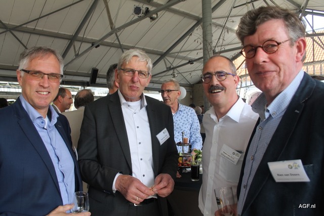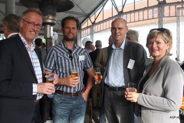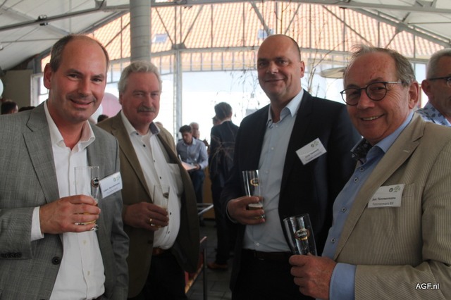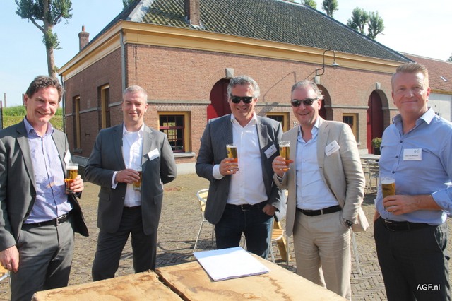 Het was de warmste dag van het jaar, dus een biertje ging er wel in bij Dirk Mulder (ING), Roland Gels (Levarht), Bart Leemans (Koppert Cress), Rob Banken (Banken Champignons) en Tom van Walsem (Limax).