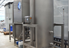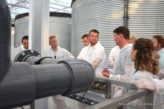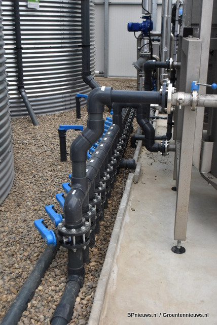 Er zijn vier secties in de kas. Die gaan via de retourput naar de zeefband, waar er gefiltreerd wordt. Dan wordt er voor het eerst ontsmet met waterstofperoxide en komt het water in de vuilwatersilo's. Na nogmaals ontsmetting met waterstofperoxide en UV komt het water in de schoonwatersilo's, waar de EC gemeten wordt en de benodigde bemesting toegevoegd wordt. De ringleiding in de kas wordt altijd doorgespoeld voor deze gebruikt wordt.