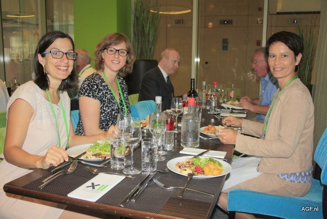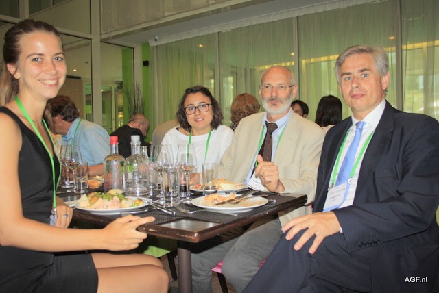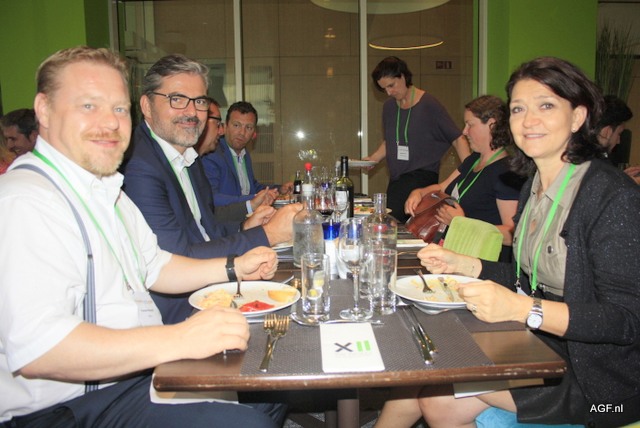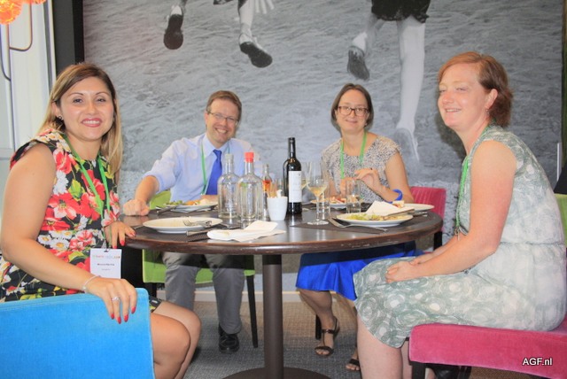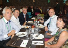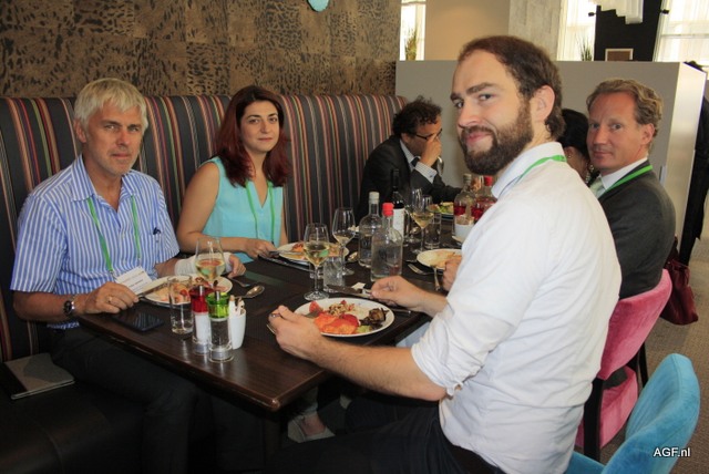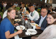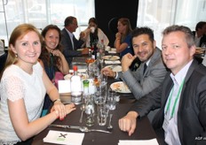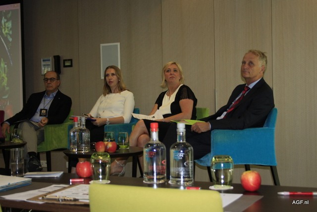 Links in het wit Eglė Baecke-Eimontaitė (Freshfel) met naast haar Marlies Galle (Primoris). Tegenover haar Roberto Vega (Syngenta) met op de voorgrond Thies Claußen (Global Fruit Point GmbH).