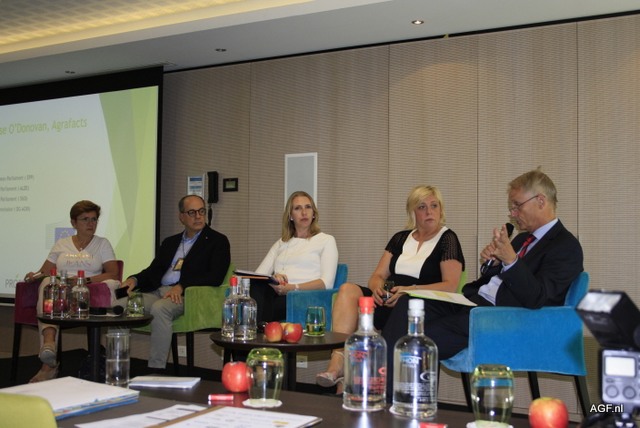 Linksvoor Luc Peeters van Belorta met daarnaast Jean- François Proust van ForumPhyto. Aan de rechterkant van voor naar achter: Dominique Dejonckeere (Copa-Cogeca), Raquel Izquierdo de Santiago (Freshfel) en Bruno de Canson (Dow AgroSciences).
