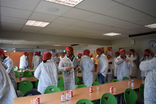 Deelnemers tokken tijdelijk een hygiënisch uniform aan voor een bezoek aan de diepvriesfabriek van Ardo