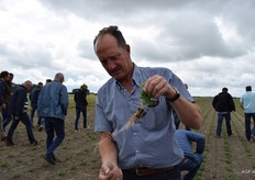 Marc van Vooren laat zien dat het wortelstelsel goed is ontwikkeld. De droogte vertraagt de groei maar hopelijk kan de knol zich komende maanden goed ontwikkelen.